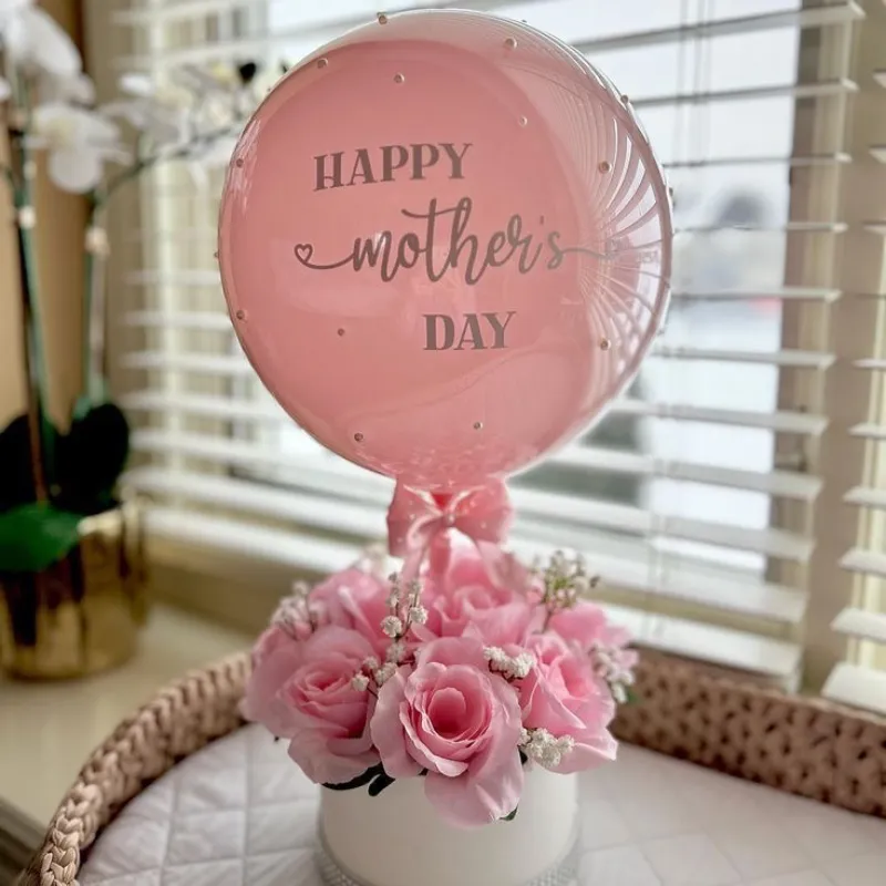 Caja de cartulina circular que contiene aproximadamente 10 rosas importadas naturales del color a elección con un globo burbuja dedicado para más decorado.