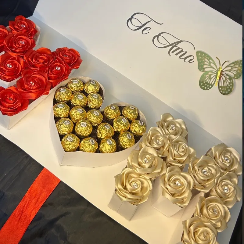 Caja en forma de libro de cartulina con inciales con rosas y bombones rellenando cada letra personalizada para mamá .