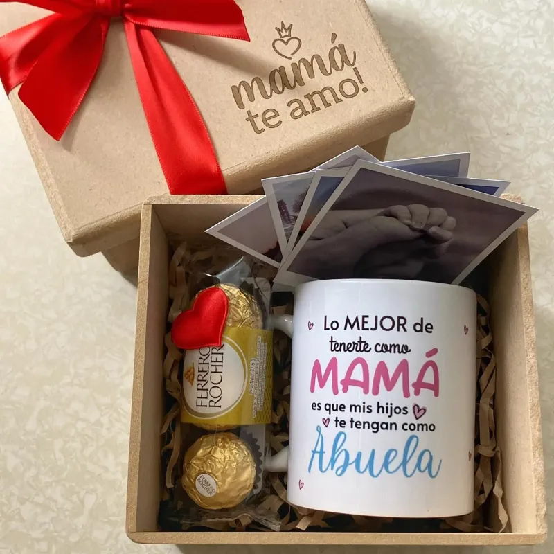 Caja de cartulina q contiene 1 taza personalizada, bombones Ferrero y dedicatoria para mamá ❤️