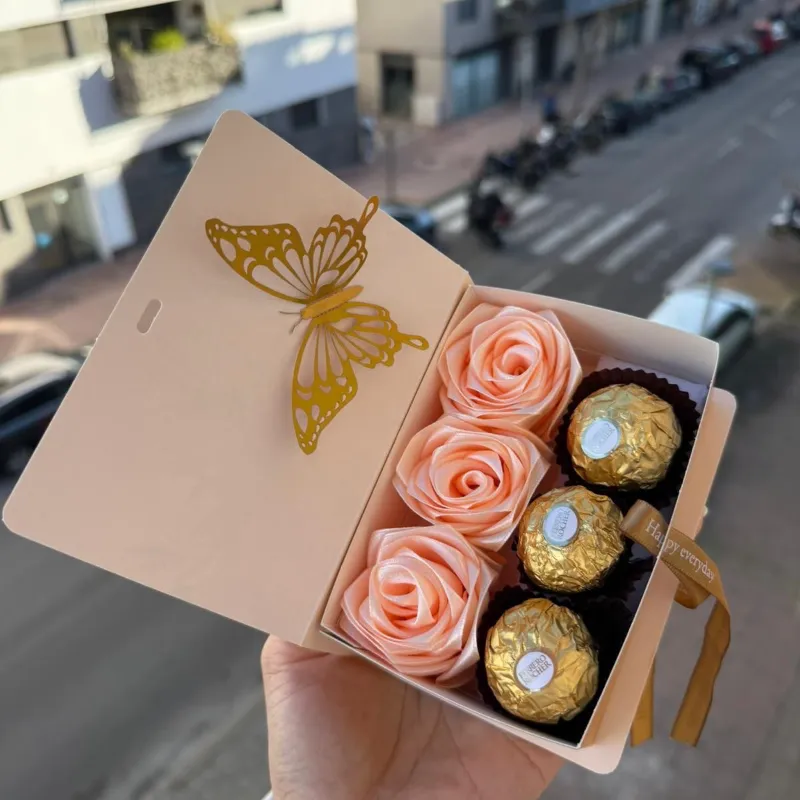 Caja peque de cartulina q contiene 3 rosas eternas y 3 bombones Ferrero Rocher .