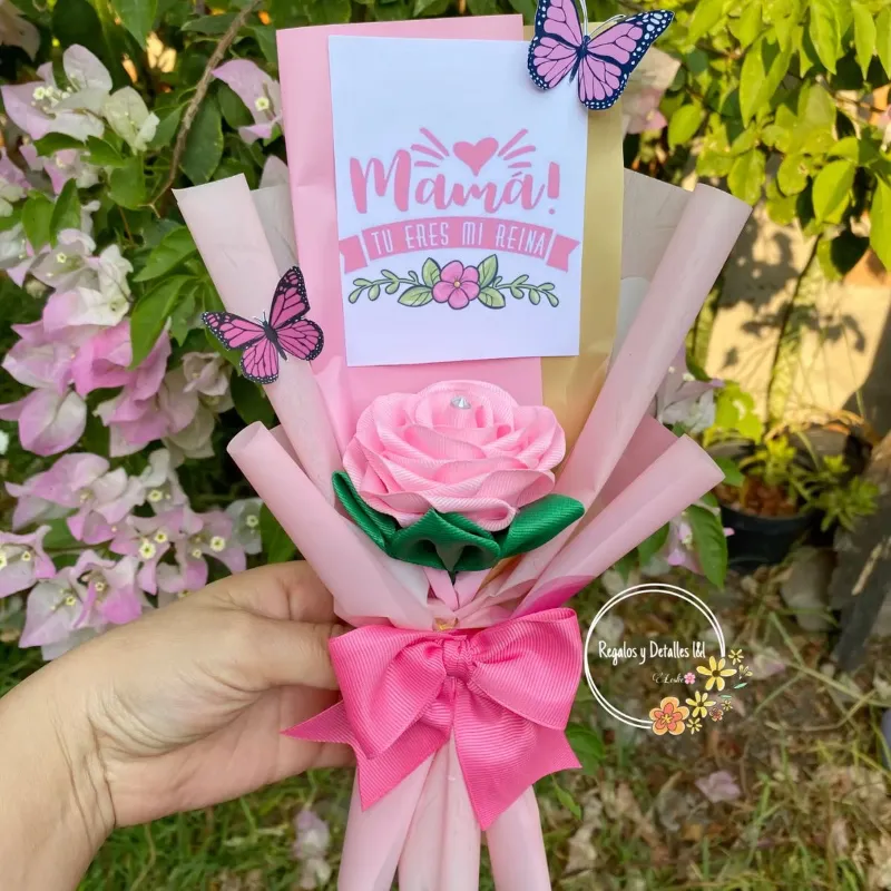 Rosa envuelta estilo ramo con dedicatoria para mamá .
