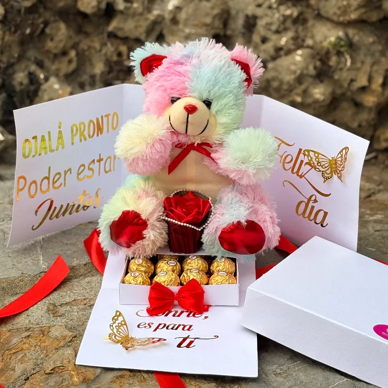 Caja de cartulina sorpresa , contiene 1 peluche de 30cm de alto , con una imitación de gaveta q trae 12 Ferreros Rocher + decoración en vinilo totalmente personalizada✨