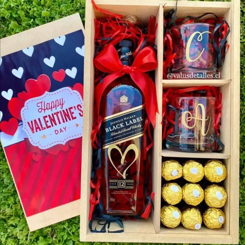 Caja q contiene 1 botella black label original , 2 vasos personalizados y bombones Ferrero Rocher 🖤