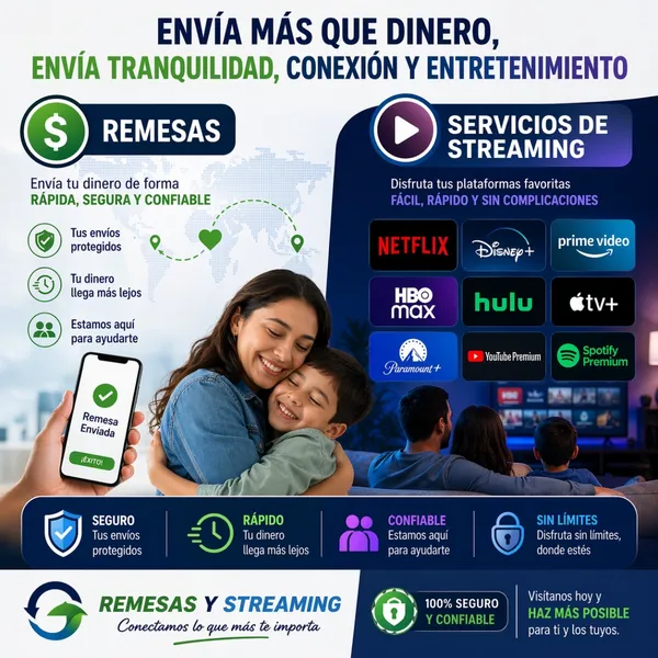 Conecta con tus raíces y disfruta del mejor entretenimiento. Ofrecemos servicio de remesas rápidas y seguras desde Estados Unidos y Europa a Latinoamérica. Además, te damos acceso a tus plataformas de streaming favoritas como Netflix, HBO Max, Crunchyroll, Disney+, Paramount+, ¡y muchas más!"