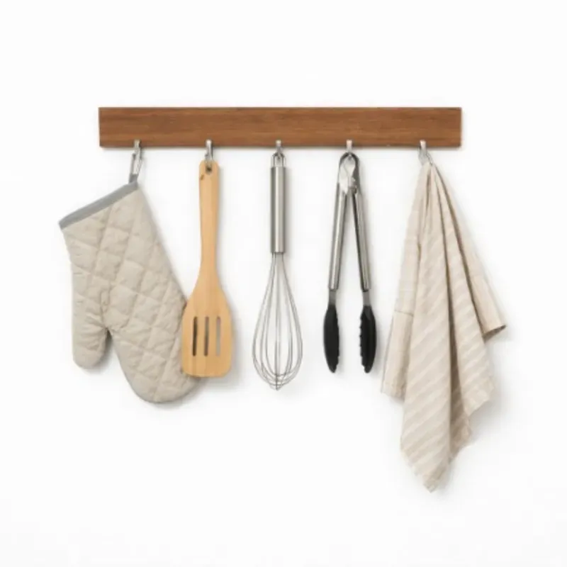 Organizador tipo perchero pequeño diseñado para colgar llaves, accesorios, mascarillas, cables u objetos ligeros. Consta de una barra horizontal plástica estilo madera con varios ganchos metálicos distribuidos uniformemente.