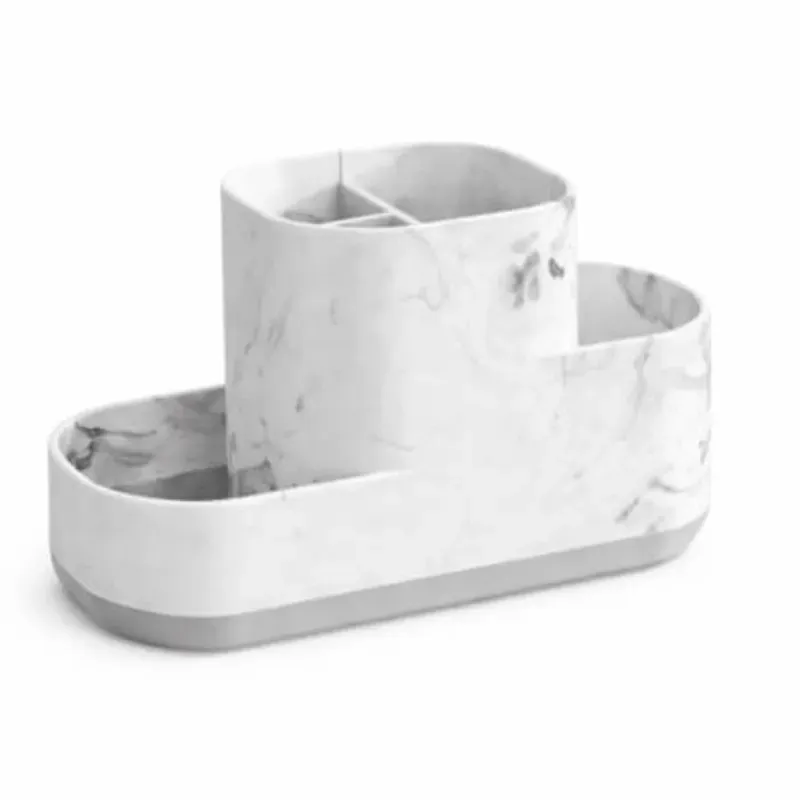 El compartimento central elevado es ideal para objetos más altos, mientras que las bandejas laterales permiten colocar elementos de uso frecuente. Además, su base con drenaje evita la acumulación de agua, ayudando a mantener los utensilios secos y más higiénicos.
