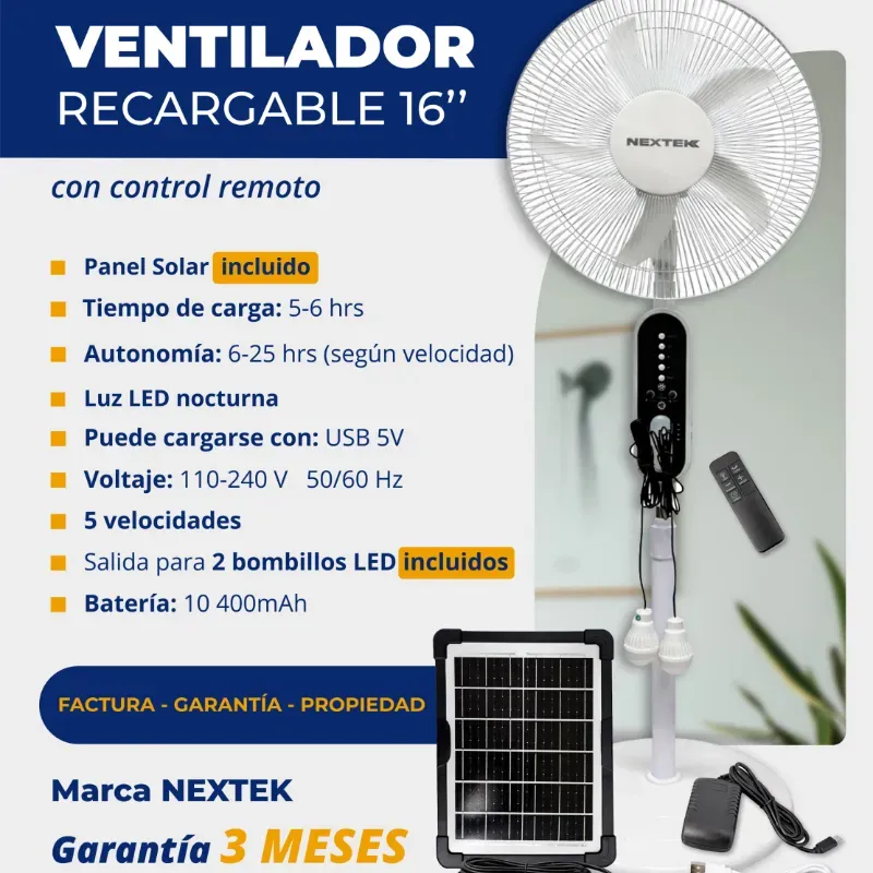 Ventilador de pedestal recargable Nextek de 16" con panel y bombillos