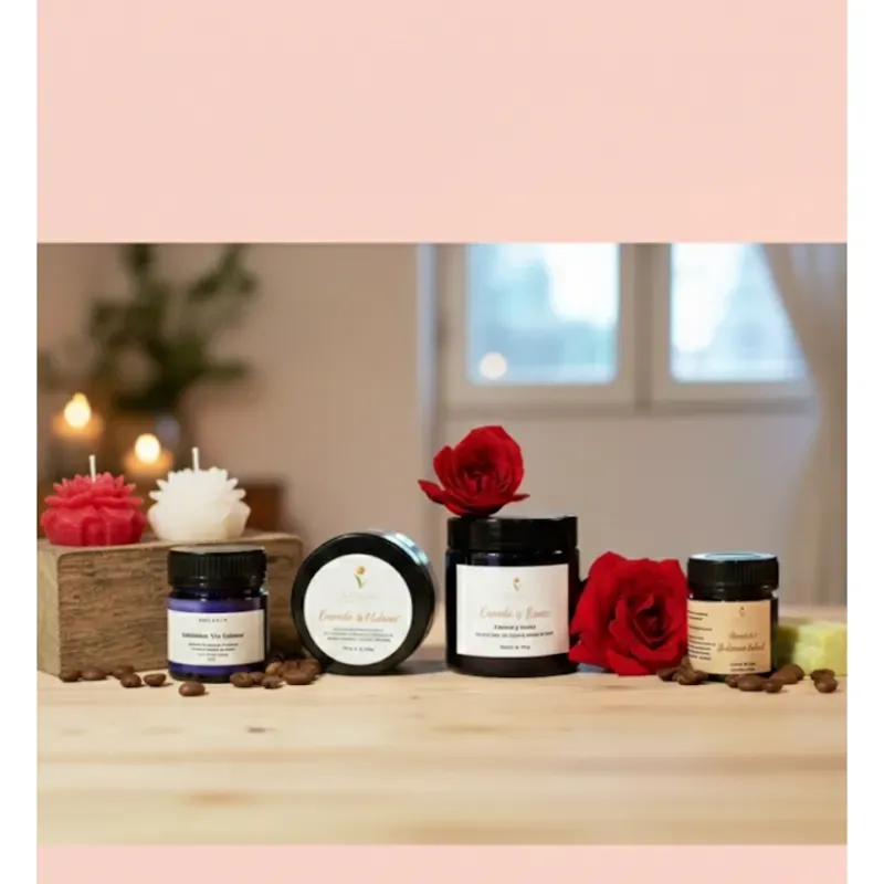 Kit de Bienestar Natural Descubre nuestro exclusivo kit de bienestar natural, diseñado para brindarte una experiencia rejuvenecedora y sensorial. Este conjunto incluye: 1.Exfoliante Físico de Miel y Café: Un potente exfoliante que combina las propiedades hidratantes de la miel con los gránulos estimulantes del café, dejando tu piel suave y radiante. 2.Mus Corporal de Canela y Rosas: Una lujosa crema que nutre la piel en profundidad, infundida con la calidez de la canela y la delicadeza de las rosas, perfecta para un masaje reparador. 3.Bálsamo Labial y Corporal de Karité: Un bálsamo multiuso elaborado con manteca de karité, que hidrata y protege tanto los labios como las áreas secas del cuerpo, garantizando suavidad y confort. 4.Tres Velas Aromáticas Pequeñas: Aromas cautivadores que transforman tu espacio, creando un ambiente acogedor y relajante. Perfectas para cualquier ocasión.Este kit es el regalo ideal para quien busca cuidar su piel y crear momentos de tranquilidad y bienestar en su rutina diaria.