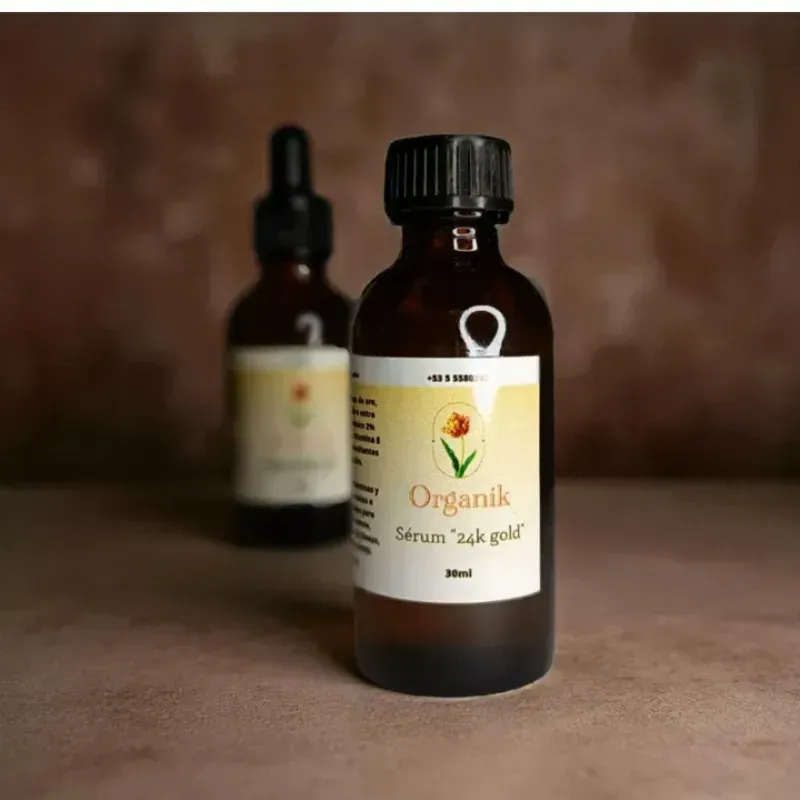 Sérum 24k Gold este producto está elaborado con láminas de oro, glicerina vegetal, oliva extra virgen, ácido hialurónico 2% (más recomendado), vitamina E.