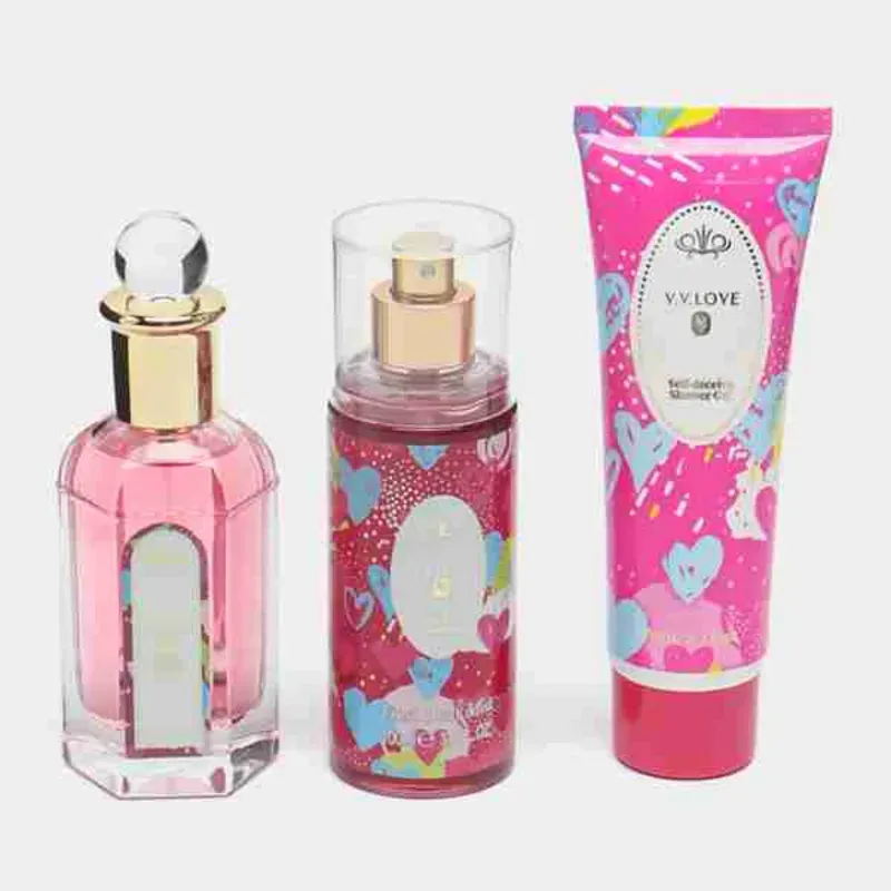 Este encantador trío de productos —perfume, body mist y crema corporal— destaca por su diseño juvenil y colorido, ideal para quienes buscan una fragancia divertida y femenina. Con notas suaves y dulces, es perfecto para el uso diario. Su presentación vibrante con corazones y tonos rosados lo convierte en un regalo atractivo y alegre.