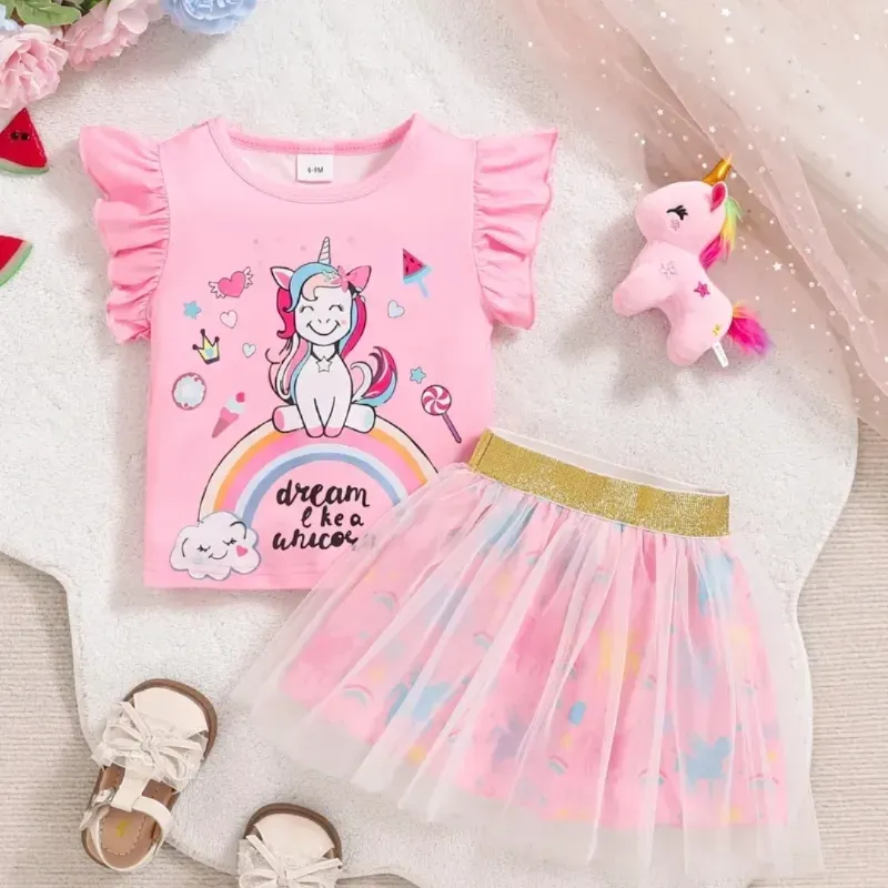 blusa con mangas de campana y estampado de unicornio arcoíris y falda de malla con estampado de unicornio