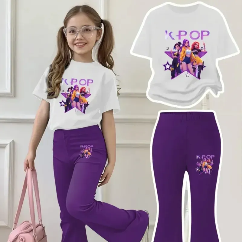 camiseta blanca de manga corta y pantalones acampanados morados