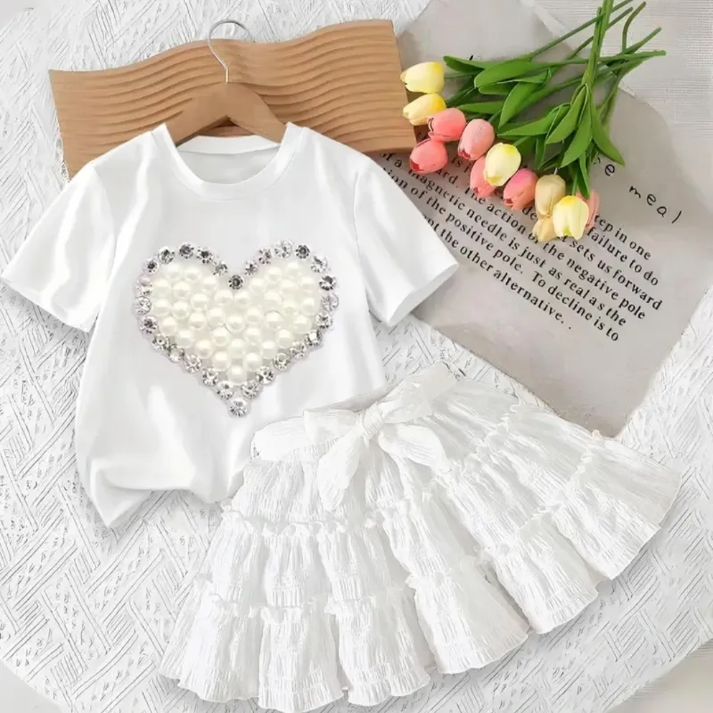 Camiseta con Estampado de Corazon con bordes de Perlas + Falda