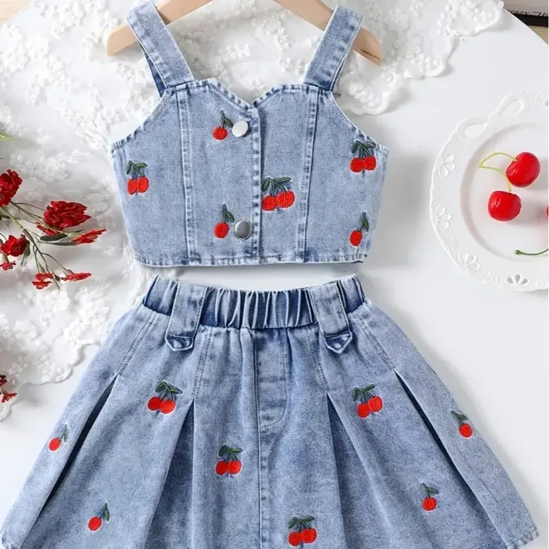 Conjunto de 2 piezas de chaleco de mezclilla bordado con cerezas + falda de mezclilla bordada con cerezas