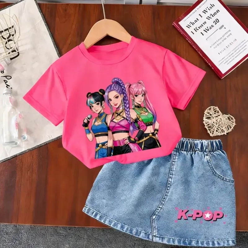 Una camiseta de manga corta y cuello redondo combinada con una falda de mezclilla