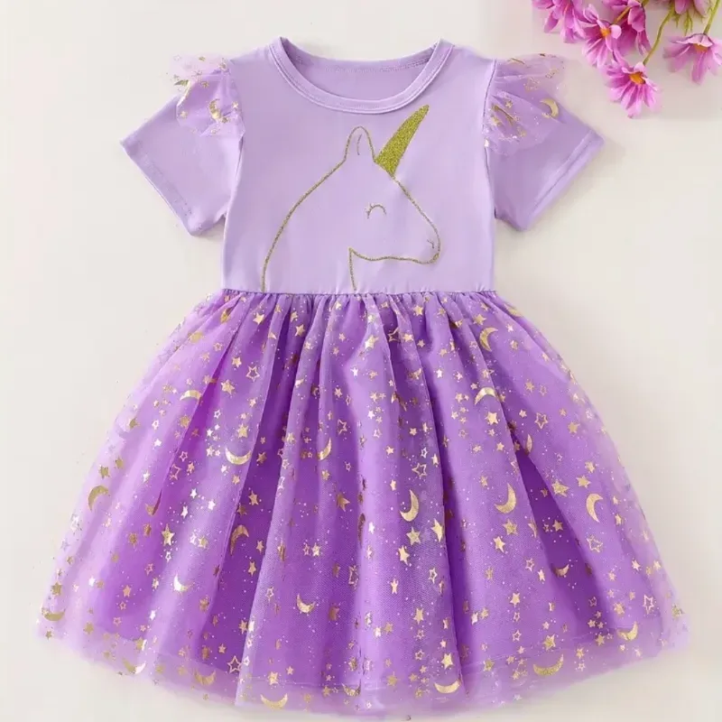 Vestido de princesa para niña con estampado de unicornio, mangas cortas y falda con panel de malla, vestido de tul