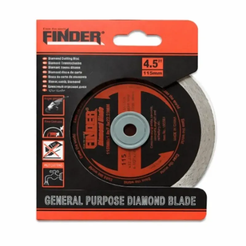 MARCA:FINDERDIÁMETRO DEL DISCO:4.5 pulgadas /115 mmESPESOR DEL SEGMENTO:7.5 mm (continuo)DIÁMETRO DEL EJE (BUJE):22.23 mmTIPO DE CORTE:Corte húmedoTIPO DE BORDE:Borde continuo diamantado::....