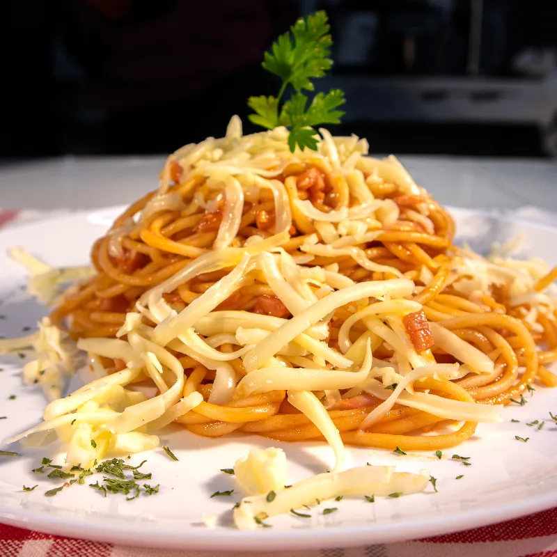 Su elección de salsa de tomate con especias italianas o jamón y queso cubierto con queso parmesano, servido con pan de ajo.