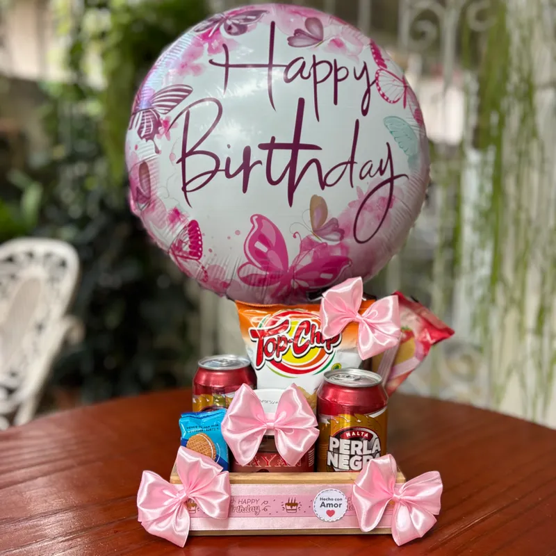 Caja decorada de tamaño mediano con confituras variadas🍬🍫 Malta o refresco (a su elección), jugos, yogurt, galleticas saladas y dulces, sorbetos, panquesitos, papitas, leche condensada, nutella….