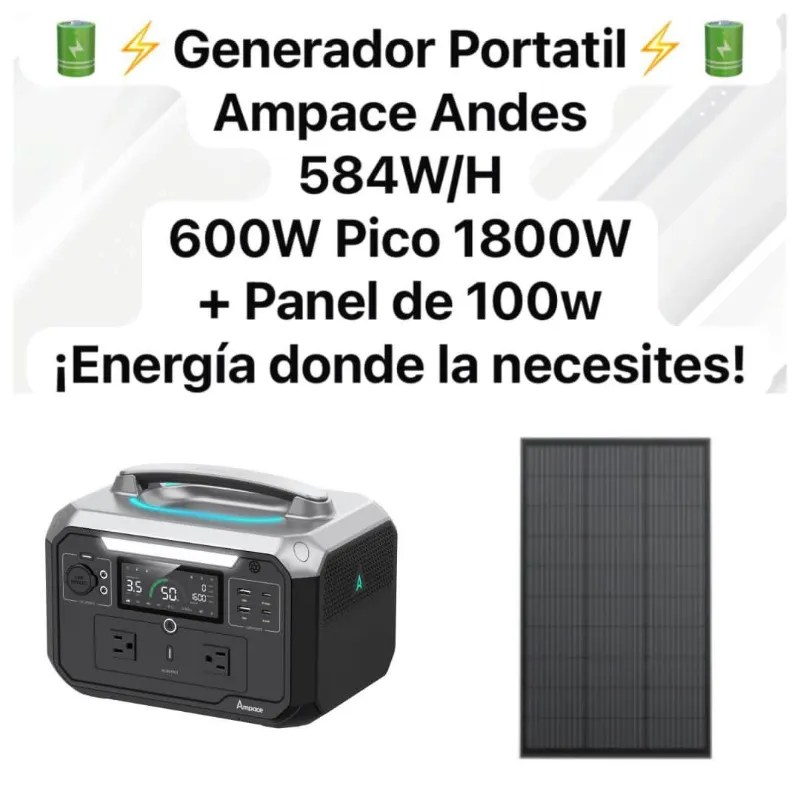 ESTACIÓN DE ENERGÍA AMPACE ANDES 600 PRO + PANEL ✅584 WH ✅600 W PICO 1800 W ✅ PANEL SOLAR 100 W