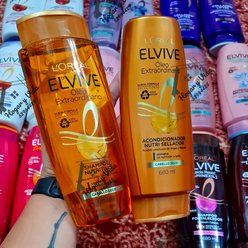 un set de champú y acondicionador de la línea Elvive Óleo Extraordinario de L'Oréal Paris, diseñado específicamente para cabello seco.