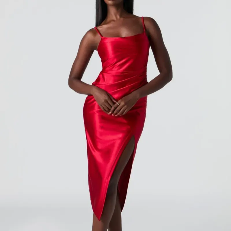Vestido rojo largo satinado con abertura en la pierna