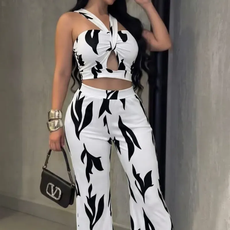 Conjunto Femenino pantalón más blusa top,color estampado blanco tallas S,M,L,XL