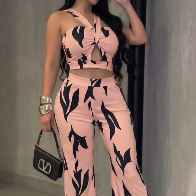 Pantalón mas blusa top, color estampado de rosa tallas S,M,L,XL