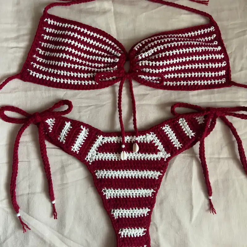 Bikini tejido a crochet con delicados detalles en contraste y conchitas decorativas que evocan el estilo del mar. Un diseño fresco y llamativo para disfrutar los días de sol.