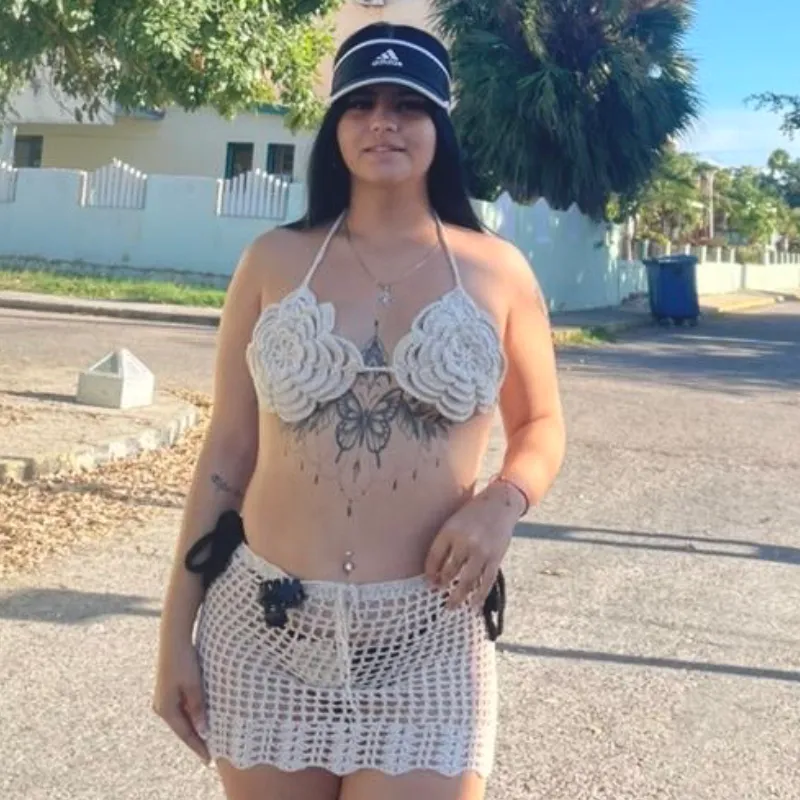 Conjunto tejido a crochet compuesto por top de flores tejidas y saya calada a juego, un diseño delicado y femenino que destaca por sus hermosos detalles florales.
