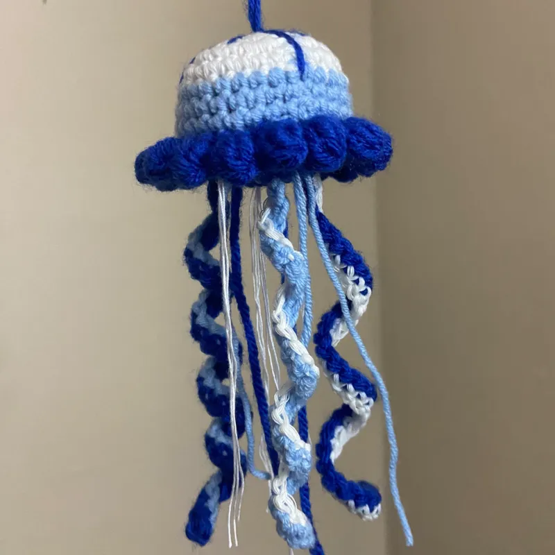 Llavero tejido a crochet con diseño de medusa y delicados detalles.