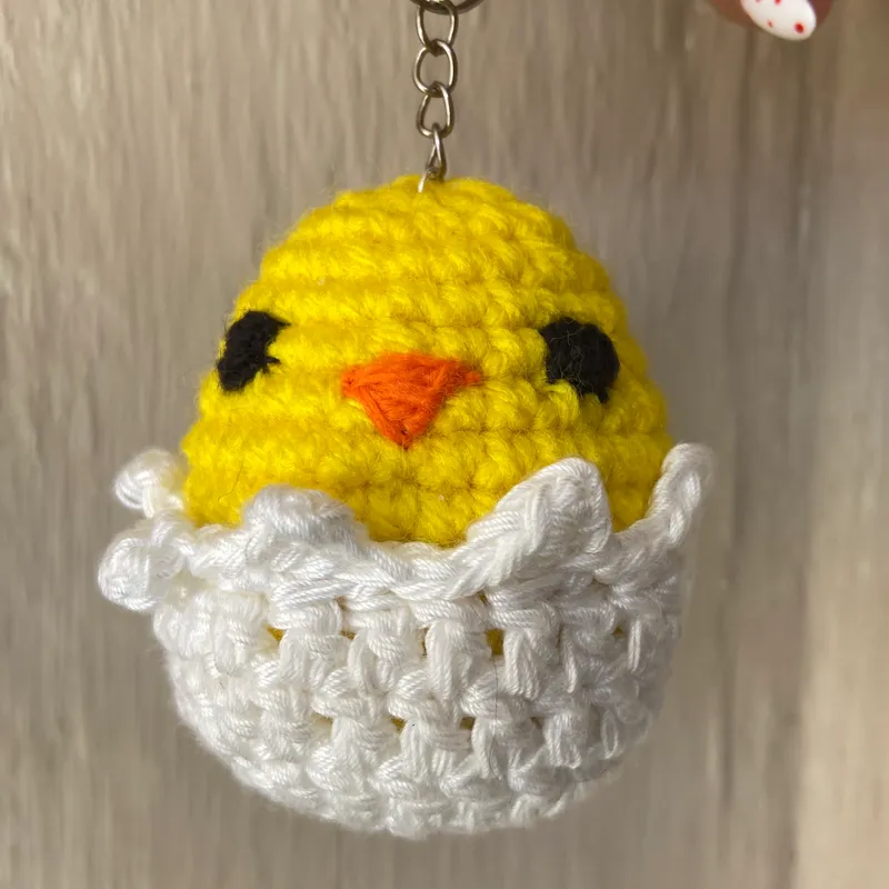 Tierno llavero tejido a crochet con diseño de pollito y delicado adorno de cascarón.