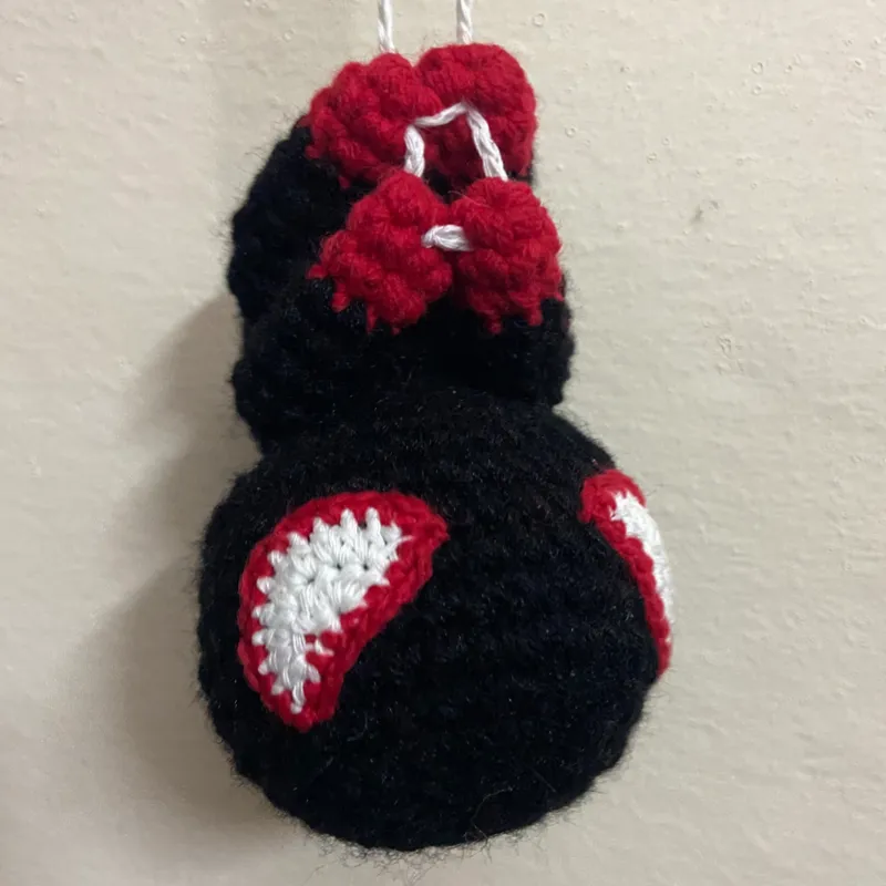 Llavero tejido a crochet con diseño de Spiderman, lleno de color y detalles llamativos.