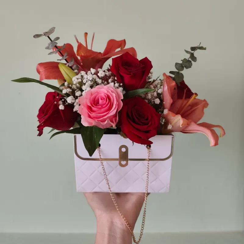 Arreglo de 6 flores naturales importadas (color y especie según disponibilidad) en base en forma de carterita, gipsofila, follaje, espuma floral y cinta. Incluye tarjeta de presentación con dedicatoria. El precio es ajustable según la cantidad, variedad y tipos de flores.