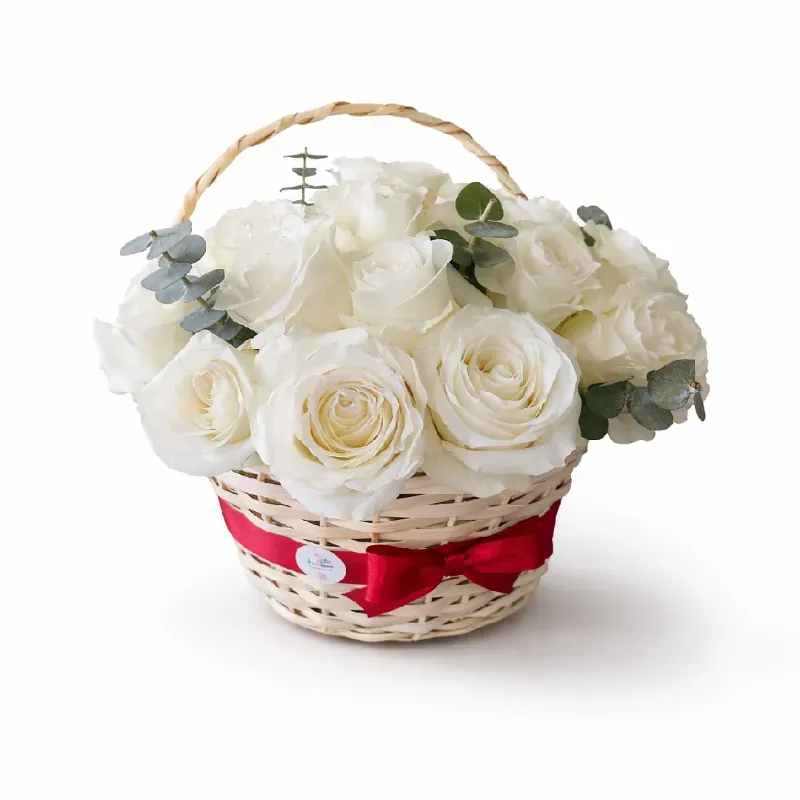 Arreglo de 24 rosas importadas en cesta artesanal, follaje, espuma floral y cinta. Incluye tarjeta de presentación con dedicatoria. El precio es ajustable según la cantidad, variedad y tipos de flores.