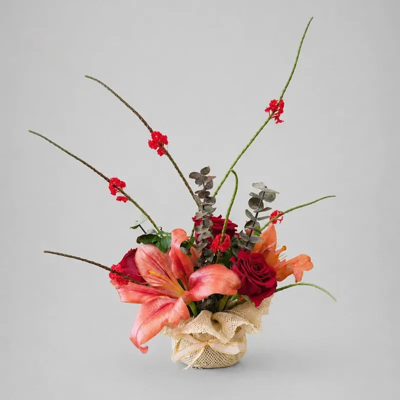 Arreglo de rosas, lirios y follaje en base de yute. De gran prestancia, funciona como complemento versátil para diversas ocasiones. El color de las flores puede variar según disponibilidad.