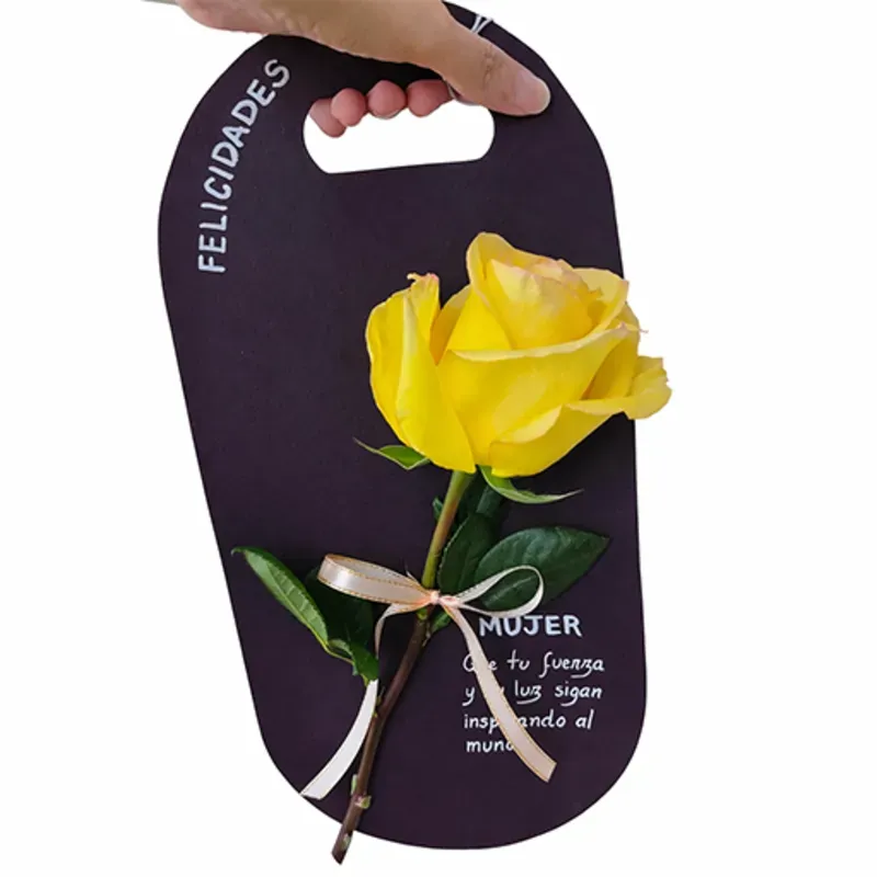 Arreglo con 1 rosa natural importada (colores según disponibilidad) presentada en base decorativa tipo colgante, con lazo de cinta y follaje natural. Incluye tarjeta de dedicatoria.
