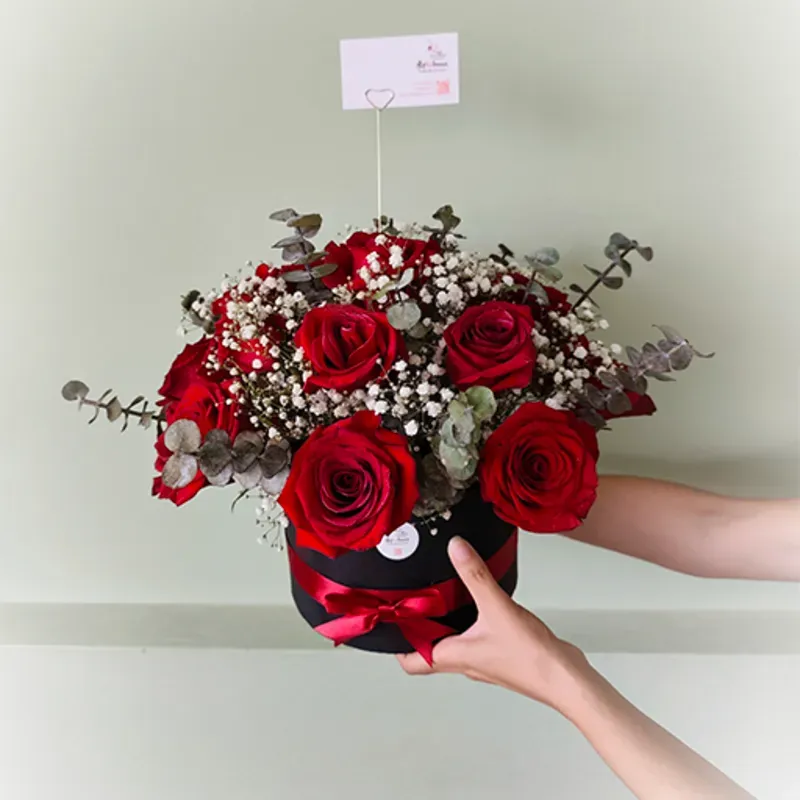 Arreglo con 15 rosas naturales (colores según disponibilidad), gipsofilia y follaje importados en sombrera con cinta. Incluye tarjeta de dedicatoria.