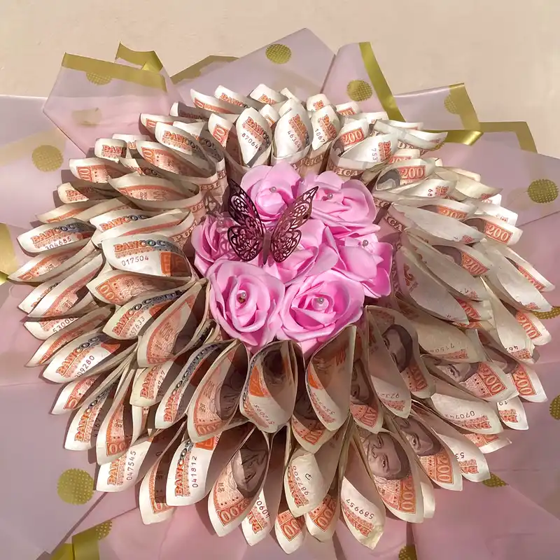 -El precio del ramo es por el material y las rosas (no incluye los billetes ) La cantidad de billetes y dinero la escoge usted .