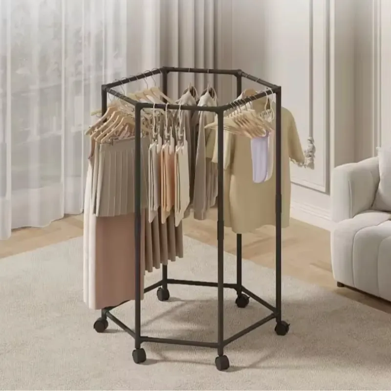 A diferencia de los percheros lineales, su diseño en anillo hexagonal permite distribuir el peso de manera uniforme, evitando inclinaciones. Es ideal para organizar la ropa del día a día, secar prendas delicadas o como perchero auxiliar para invitados. Gracias a sus ruedas con freno, puedes moverlo fácilmente del área de lavado al dormitorio.
