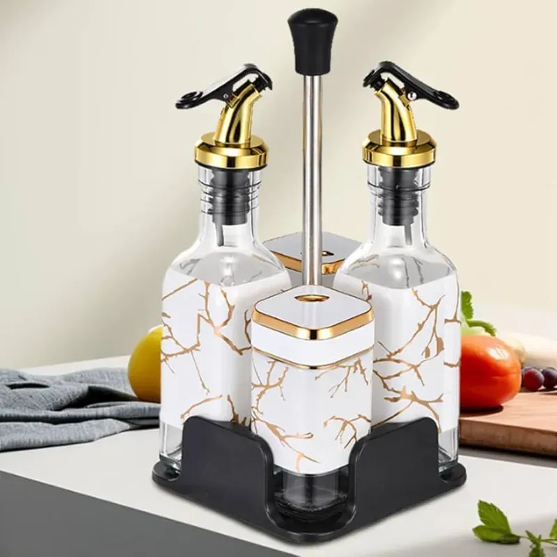 Mantén tus aderezos favoritos organizados y siempre a mano con este moderno set de cocina. Su diseño vertical optimiza el espacio en tu encimera o mesa, mientras que el acabado en blanco y oro añade un toque contemporáneo. Ideal para el uso diario o para ocasiones especiales donde la presentación lo es todo.