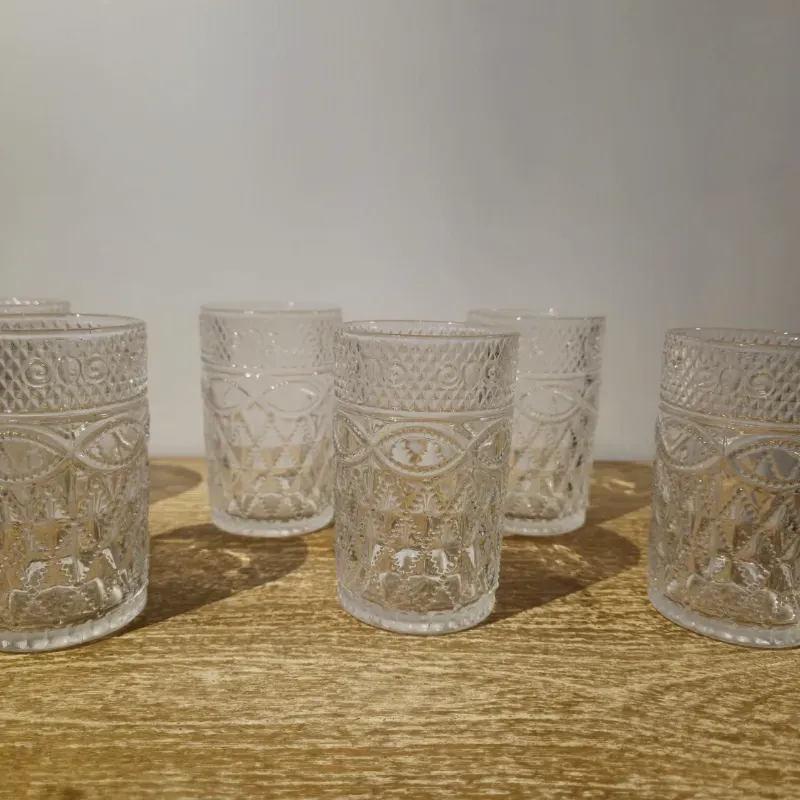 Añade un toque de sofisticación atemporal a tu hogar con este set. Inspirados en el diseño de cristalería antigua, estos vasos no son solo recipientes, sino piezas decorativas que capturan y reflejan la luz de manera única gracias a su intrincado relieve.