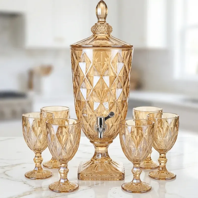 Haga que el servicio de bebidas sea el centro de atención de su próxima reunión con este práctico y elegante set. Olvídese de estar rellenando jarras constantemente; este dispensador de gran capacidad le permite preparar sus bebidas favoritas y dejar que sus invitados se sirvan a su gusto. El diseño de vidrio ámbar con patrón de diamante le da un aspecto vintage y sofisticado, mientras que el grifo de metal resistente asegura un flujo de bebida constante y sin derrames. El set incluye seis copas coordinadas, lo que lo convierte en una solución completa y estética para sus necesidades de servicio. Desde una barbacoa en el jardín hasta una cena formal, este juego es la combinación perfecta de forma y función.