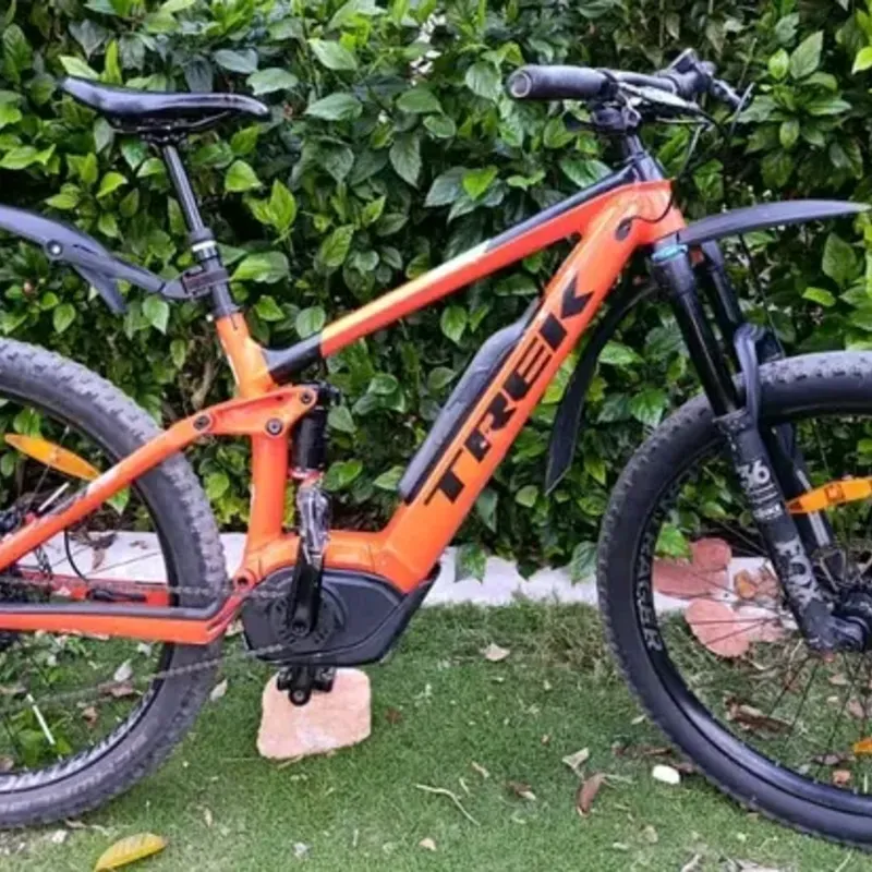 Bicicleta de MTB asistida o Ebike, maraca Trek de catálogo modelo PowerFlay LT9, cuadro de aluminio bien resistente y reforzado, talla M de 17', sistema electromecánico de Bosch con motor Performance Line CX, transmisión SRAM completa de amplio rango, frenos también SRAM Guide, todos sus demás componentes Bontrager de catálogo, rodada 27.5 (aunque le cabe rodada 29 con un balón de más de 2.30), amortiguador Rock Shox Reaktive Deluxe, y suspensión delantera Fox de barras negras de 36mm de diámetro, cubiertas Schwalbe, tija telescópica, pedales Shimano Deore XT...