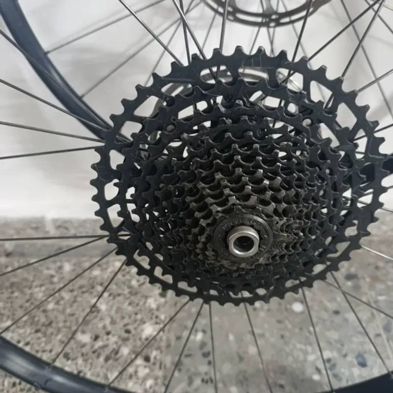 Par de ruedas Roval Control de MTB de 62225mm, muy ligeras, impecables, de 28 radios ambas, bujes de cajas de bola y eje pasante boost de 12148 y 15*110mm, con discos de tornillos SRAM 180 y 160mm, núcleo HG compatible con 12v tronador, con cassette SRAM NX instalado de 12v relación 11-50T.