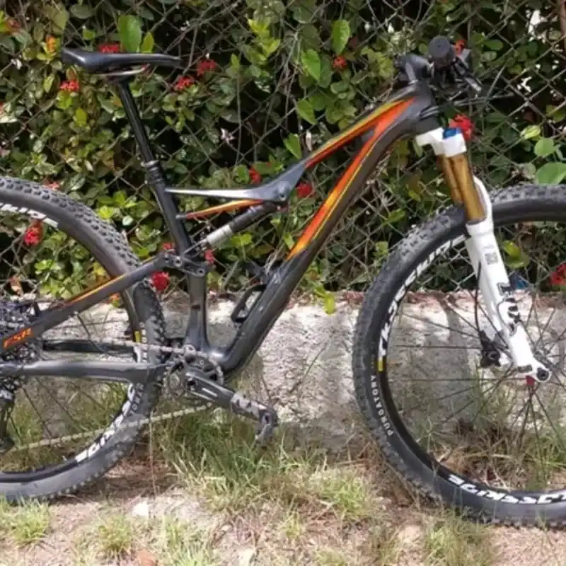 Bicicleta de MTB, Cuadro Specialized StumpJumper FSR de MTB talla M de 17.5', de fibra de carbón con suspensión Fox Float CTD, de cableado interno, dirección cónica, con sistema Swat para almacenamiento de herramientas y demás en el interior del cuadro, muy fuerte y ligero, con su tija telescópica original bien ligera de 30.9mm de diámetro con mando al manillar, suspensión delantera Fox Kashima de barras de 32mm de diámetro y 110mm de recorrido, control de bloqueo y rebote manual.