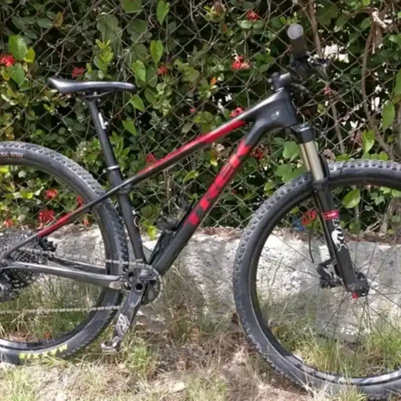 Bicicleta de MTB rodada 29', marco Trek Pro Caliber 9.9 de fibra de carbón, talla XS de 14.5', eje pasante no Boost, sistema de absorción de impactos Isospeed, cajón de biela presfit, cableado interno y dirección cónica de rodamientos sellados.