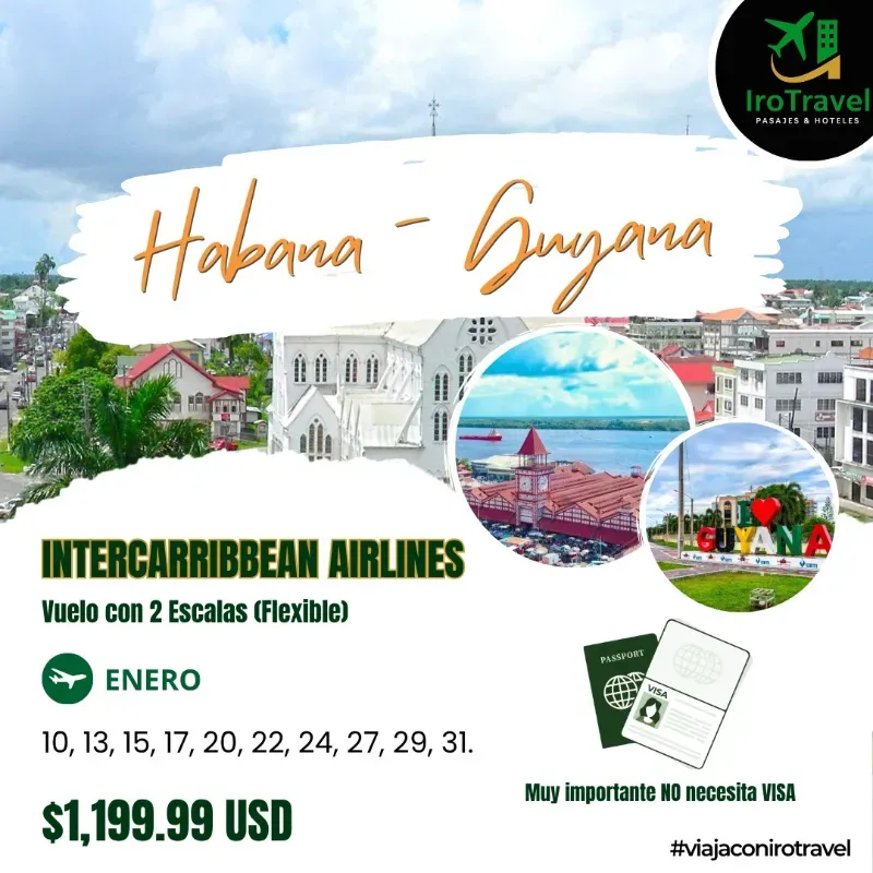 AEROLÍNEA INTERCARRIBBEAN AIRLINES TIPO DE VUELO Vuelo con 2 Escalas (Flexible) FECHAS DISPONIBLES (ENERO) 10, 13, 15, 17, 20, 22, 24, 27, 29, 31 PRECIO $1,199.99 USD NOTA IMPORTANTE NO necesita VISA