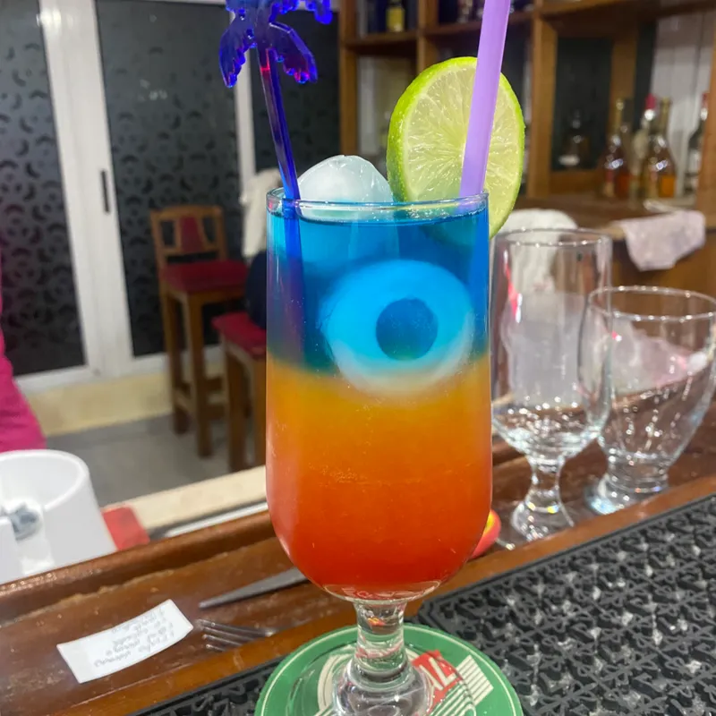 Ingredientes: jugo de naranja, granadina, curacao azul y ron Havana club 3 años
