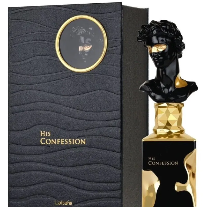 His Confession de Lattafa es una fragancia de la familia olfativa Oriental Amaderada para Hombres. Las Notas de Salida son lavanda, canela y mandarina; las Notas de Corazón son iris, benjuí, ciprés y Mahonial; las Notas de Fondo son vainilla, haba tonka, ámbar, incienso, cedro y pachulí.